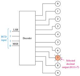 - A decimal-to-BCD encoder will convert one active input out of ten to a BCD code on the output.